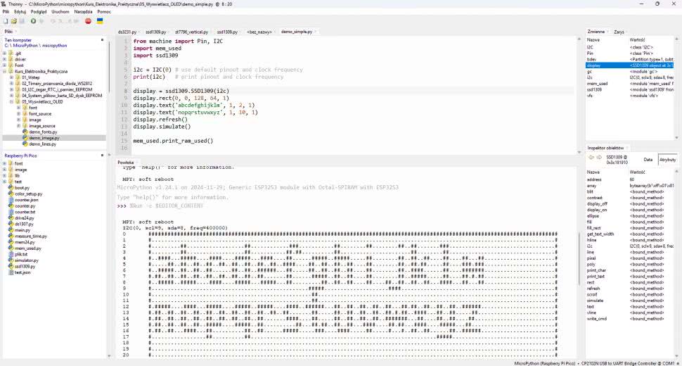 Do generowania grafiki wykorzystamy moduł FrameBuffer, który jest standardowo wbudowany w implementację MicroPythona na ESP32. Dokładny opis wszystkich możliwości tego modułu znajduje się pod adresem [4].