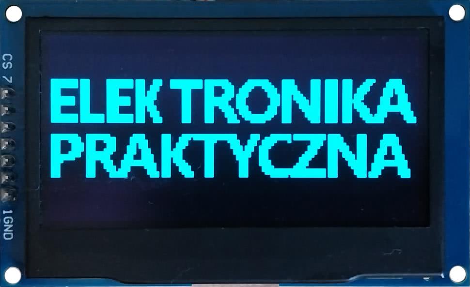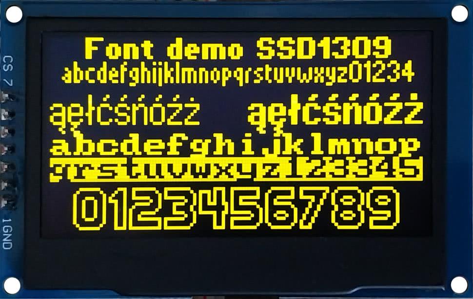 W tym odcinku kursu nauczymy się obsługiwać wyświetlacz OLED o przekątnej 2,42 cala i rozdzielczości 128×64 pikseli z wbudowanym sterownikiem SSD1309 firmy Solomon Systech. Takie wyświetlacze produkuje chińska firma Wisevision Optronics. Dostępne są w kolorach: białym, żółtym, zielonym i niebieskim. Istnieją także tańsze wyświetlacze o mniejszych rozmiarach i tej samej rozdzielczości. Na rynku można znaleźć podobne rozwiązania z nieco innymi sterownikami, takimi jak SSD1306 lub SH1106. Wszystkie te sterowniki są bardzo podobne i kod, który napiszemy dla SSD1309, powinien działać bez żadnych modyfikacji także z innymi sterownikami.
