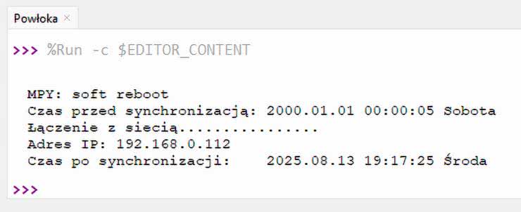 W linii 9 wywołujemy funkcje: Wi-Fi_connect, a następnie settime z modułu ntptime. Funkcja pobierze aktualny czas i zapisze w systemie, po czym ponownie wyświetlimy czas systemowy, aby zobaczyć, że nasz program pracuje prawidłowo. Efekt działania tego kodu pokazuje rysunek 2.