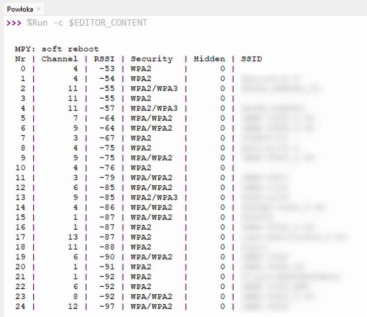 Następnie w linii 3 musimy uaktywnić naszą klasę, po czym wywołujemy metodę scan (linia 4). Ta metoda zwraca listę krotek, po jednej na każdą znalezioną sieć. Każda krótka składa się z następujących danych: