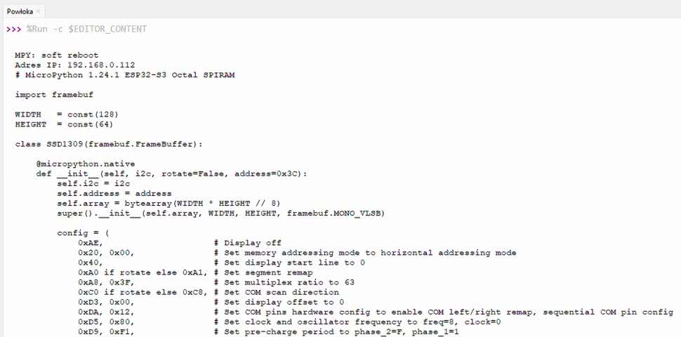W naszym przykładzie pobieramy plik ssd1309.py (omawiany w 5 części kursu) z repozytorium kursu na GitHubie. W taki sposób możemy pobrać każdy plik i zapisać go w pamięci systemu plików MicroPythona. Nic nie stoi na przeszkodzie, by pobrać program napisany w Pythonie, a następnie go uruchomić.