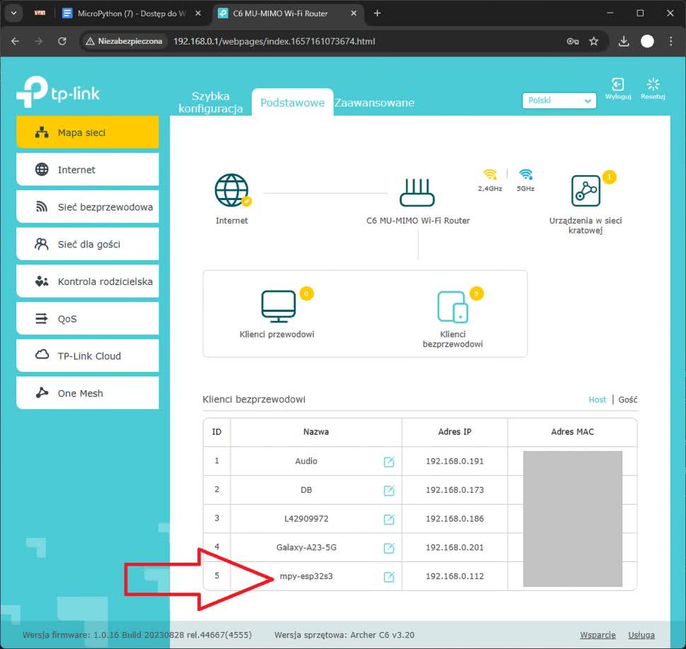Adresy wszystkich urządzeń znajdujących się w Twojej sieci Wi-Fi możesz uzyskać logując się do ustawień routera. Wskazówkę jak to zrobić, znajdziesz na naklejce z tyłu routera. Zwykle wystarczy otworzyć przeglądarkę internetową i w pasku adresu wpisać IP routera 192.168.0.1. W moim przypadku wygląda to tak, jak na rysunku 5. Widać tam adresy wszystkich urządzeń, w tym mikrokontrolera ESP32 pod nazwą mpy-esp32s3 i pod adresem IP 192.168.0.112.