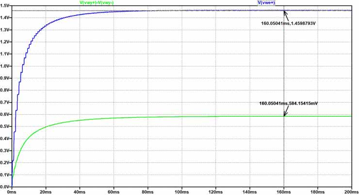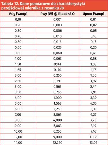Jak wynika, z racji obecności w tych układach diod prostowniczych oraz obciążenia rezystancjami samych ustrojów pomiarowych, symulowane napięcia zmierzone są dość dalekie od spodziewanych odpowiednio: 1,0 V i 2,0 V. Właśnie dlatego autor postanowił wykonać dla układów z rysunku 79 szereg symulacji – dla sinusoidalnych napięć sterujących Vsig o amplitudzie zmienianej w zakresie od 0,1 V do 14 V. Rezultaty tych symulacji zostały ujęte w tabelach 11 i 12, a także na wykresach na rysunkach 81 i 82.