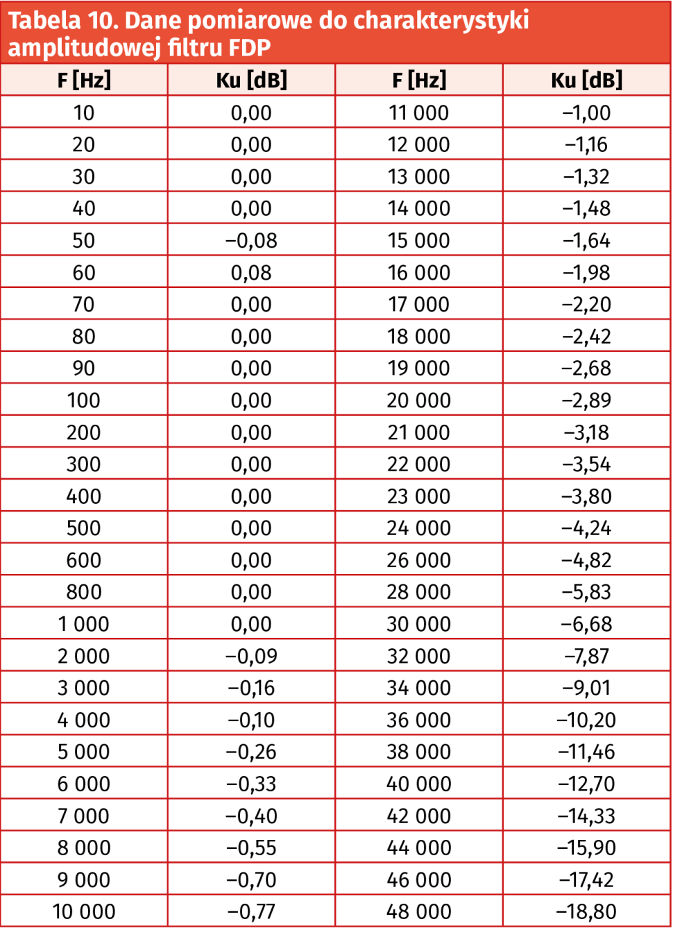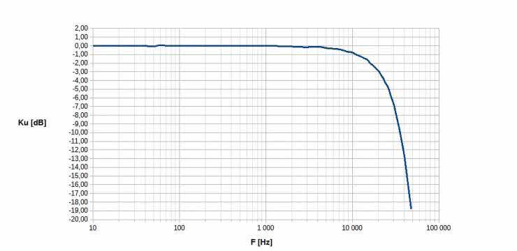 Co prawda nowe rozwiązanie wprowadza nieco większe opóźnienia grupowe do toru przetwarzania sygnału, jednak nie ma to żadnego istotnego wpływu na uzyskiwane w systemie pomiarowym wyniki. Natomiast opóźnienie grupowe w pasmie przenoszenia dla nowego rozwiązania filtra jest nawet nieco bardziej wyrównane, niż to miało miejsce w przypadku filtra stosowanego wcześniej, co należy uznać za korzystną zmianę. Rysunek 73 prezentuje wykres uzyskanej pomiarowo charakterystyki amplitudowej jednego z nowo zaprojektowanych filtrów (dane źródłowe do tego wykresu zawiera tabela 10).