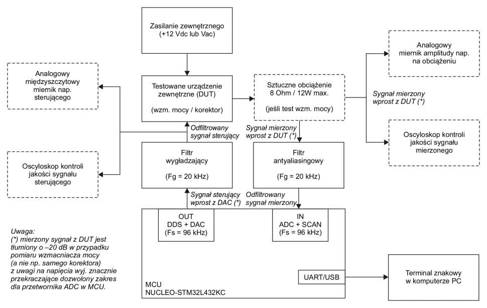 Do bloków opcjonalnych należy w pierwszej kolejności sztuczne obciążenie 8 Ω/12 W (max.), które było niezbędne wyłącznie do testowania wzmacniaczy mocy m.cz., ale nie było potrzebne np. do testów samodzielnego korektora audio (bez wzmacniacza mocy). Mniej istotnymi, chociaż w ocenie autora tego opracowania, bardzo przydatnymi w trakcie przeprowadzonych pomiarów blokami, są: analogowe, zgrubne mierniki napięcia sterującego oraz napięcia na obciążeniu (wraz z dedykowanymi układami prostowniczymi) a także oscyloskopy, przeznaczone do wizualnej kontroli jakości tychże napięć. Sygnał wytworzony w wewnętrznym, programowym generatorze DDS, pracującym z częstotliwością próbkowania Fs=96 kHz, przekonwertowany na sygnał analogowy w przetworniku DAC (zlokalizowanym w MCU STM32L432KC na płytce NUCLEO) jest podawany na filtr wygładzający górnej częstotliwości granicznej Fg=20 kHz. Stamtąd dalej trafia na wejście testowanego urządzenia zewnętrznego (DUT). Z wyjścia urządzenia DUT sygnał mierzony dociera na wejście filtra antyaliasingowego (istotnego m.in. z uwagi na możliwość powstawania w DUT pasożytniczych częstotliwości harmonicznych) i dalej na wejście przetwornika ADC (także zlokalizowanego w MCU STM32L432KC na płytce NUCLEO), pracującego z tą samą częstotliwością próbkowania (Fs=96 kHz). W przypadku pomiaru sygnałów na wyjściu wzmacniaczy mocy, przebiegi te były wstępnie tłumione o –20 dB, by nie przekroczyły dozwolonego zakresu przetwarzania napięć przez przetwornik ADC. Następnie zmierzone przez ADC próbki sygnału były skanowane i analizowane pod kątem wyznaczenia ich minimalnych i maksymalnych wyników (osobno dla każdej częstotliwości pomiarowej Fpom), wartości skrajne były z kolei wykorzystywane do wyliczenia napięcia [Vp-p] na wyjściu testowanego DUT. Finalnie, kolejne pary wartości: (Fpom [Hz], Upom [Vp-p]), gdzie zachodziło Upom=f(Fpom), były wysyłane do terminala tekstowego w komputerze PC – celem ich wizualizacji i dalszej obróbki przez operatora opisanego minisystemu pomiarowego.