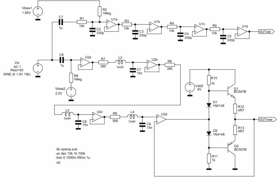Jak wspomniano wcześniej, wykorzystane tutaj środowisko pomiarowe w części sprzętowej zostało w znacznej mierze oparte o koncepcję platformy sprzętowej, użytej w testach filtrów cyfrowych, jednak istotnej modernizacji zostały poddane przede wszystkim bloki analogowych filtrów: wygładzającego i antyaliasingowego. W szczególności czterostopniowe, połączone łańcuchowo, proste filtry RC (czwartego rzędu) zastąpiono trzystopniowymi, połączonymi łańcuchowo filtrami RLC (szóstego rzędu). Zabieg ten pozwolił jednocześnie zwiększyć impedancje wejściowe omawianych bloków filtrów (z uwagi na brak obciążających źródła sygnałów członów RC na wejściach filtrów), a także poprawić stromość opadania ich charakterystyk częstotliwościowych w okolicach górnych częstotliwości granicznych Fg=20 kHz tychże filtrów. Dodatkowo na wyjściu układu filtra wygładzającego dodano niskoimpedancyjny wtórnik z komplementarną parą tranzystorów, pracującą w klasie 2×AB. Zabieg ten miał na celu zmniejszenie impedancji wyjściowej i zwiększenie wydajności prądowej układu, którego przeznaczeniem było wysterowanie testowanego urządzenia zewnętrznego DUT o nieznanej impedancji wejściowej. Rysunek 70 prezentuje schematy dwóch wariantów omawianych filtrów dolnoprzepustowych, przygotowanych na potrzeby wykonania symulacji porównawczych w środowisku LTspice: starej wersji „4×RC” z filtrów cyfrowych oraz nowej wersji „3×RLC” z omawianego tutaj minisystemu pomiarowego.