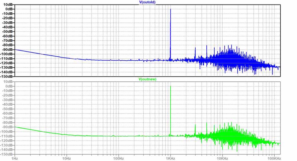 Co prawda wizualna ocena ich czystości widmowej nie budzi żadnych zastrzeżeń, ale powszechnie przyjmuje się, że harmoniczne zniekształcenia nieliniowe przebiegów sinusoidalnych na poziomie ≤5% są niezwykle trudne do wychwycenia gołym okiem. Mając na uwadze szczególnie wysokie wymagania jakościowe stawiane torom pomiarowym, uzyskane pełne, jednosekundowe przebiegi wyjściowe V(OUTold) oraz V(OUTnew) poddano dodatkowo obliczeniowej analizie Fouriera, której wyniki pokazano na rysunku 75. Wnioski z nich są takie, że przyjmując główne składowe widma obu przebiegów V(OUTold) oraz V(OUTnew) na umownym poziomie 0 dB, w obu przypadkach otrzymano widma sygnałów pasożytniczych (zniekształceń nieliniowych) o bardzo zbliżonych kształtach i na poziomach praktycznie nieprzekraczających –80 dBc (względem poziomu podstawowej harmonicznej). Dodatkowo w widmie zakłóceniowym występują praktycznie jedynie nieparzyste harmoniczne (3 kHz, 5 kHz, 7 kHz, …), co korzystnie świadczy o symetrycznej pracy obu instancji filtrów (także nowego projektu – ze wzmacniaczem tranzystorowym na wyjściu).