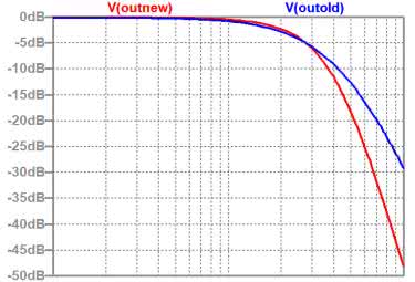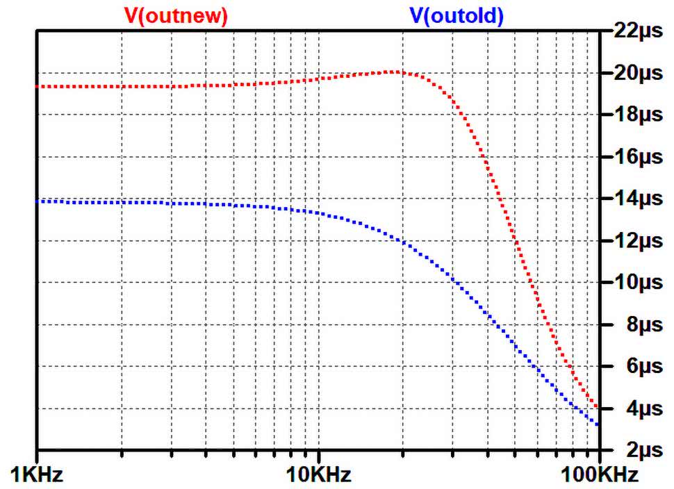 Oba tory filtrów były pobudzane z tego samego źródła sygnału sinusoidalnego, a ich napięcia wyjściowe były dostępne na portach oznaczonych etykietami: OUTold oraz OUTnew. Na rysunku 71 przedstawiono charakterystyki amplitudowe przenoszenia obu torów w zakresie częstotliwości od F=1 kHz do F=100 kHz.