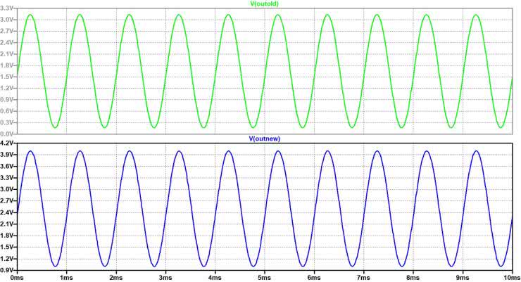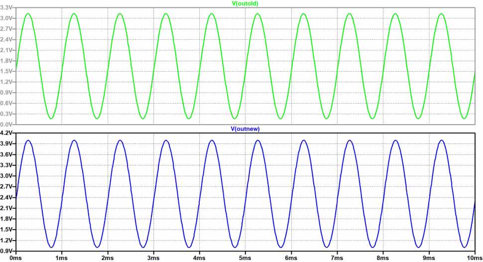 Jak nie trudno zauważyć, obie charakterystyki (symulowana oraz zdjęta pomiarowo) są ze sobą zgodne, co dodatkowo potwierdza poprawność nowego projektu pomocniczych filtrów analogowych. Ponieważ w torze filtra wygładzającego na wyjściu dodano wtórnik z komplementarną parą tranzystorów bipolarnych (stopień z zasady nieliniowy) pracujących w klasie 2×AB, autor postanowił dodatkowo przeprowadzić symulację komputerową w dziedzinie czasu. I tak oba tory filtrów, stary i nowy, były pobudzane tym samym sygnałem sinusoidalnym Vin o amplitudzie 1,5 V (3,0 Vp-p) i częstotliwości F=1 kHz. Rysunek 74 prezentuje 10-cio milisekundowe wycinki sinusoidalnych przebiegów napięć wyjściowych V(OUTold) oraz V(OUTnew).