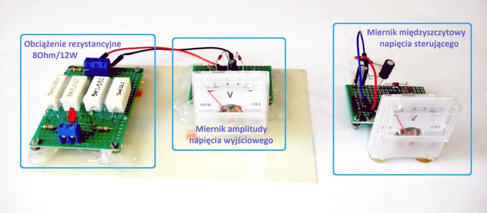 Na potrzeby zaplanowanych pomiarów opracowano trzy proste układy towarzyszące, pokazane na fotografii 8: sztuczne obciążenie rezystancyjne 8 Ω/12 W max., dedykowany do tego sztucznego obciążenia analogowy (zgrubny) miernik napięcia szczytowego na obciążeniu oraz analogowy (także zgrubny) miernik międzyszczytowej wartości napięcia sterującego (tzn. na wyjściu filtra wygładzającego sygnał z przetwornika DAC, zlokalizowanego w MCU na płytce NUCLEO).