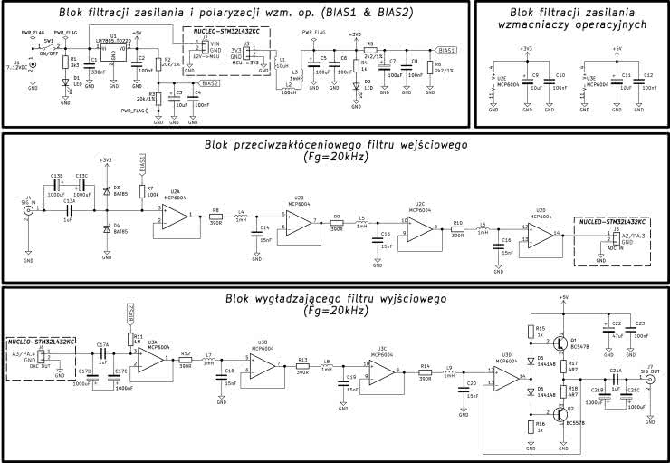 Rysunek 76 przedstawia schemat elektryczny opracowanych filtrów wraz z towarzyszącymi obwodami zapewniającymi prawidłowe zasilanie całego systemu pomiarowego. Układ zasilany jest z zewnętrznego źródła stałoprądowego o napięciu Uzas=7...12 VDC i wydajności prądowej nie mniejszej niż 1 A (bezpieczna wartość) przez złącze koncentryczne J1. Zasilanie jest załączane przełącznikiem SW1, a obecność napięcia sygnalizuje dioda LED D1, której maksymalny prąd roboczy ogranicza rezystor R1. Napięcie Uzas jest podawane wprost na złącze wejścia zewnętrznego zasilania na płytce NUCLEO, oznaczone na schemacie jako J2 (piny VIN oraz GND na płytce NUCLEO), a także na wejście stabilizatora scalonego U1 (LM7805), który – wraz z rekomendowanymi przez producenta tego układu kondensatorami C1 i C2 – zapewnia napięcie stabilizowane +5 VDC, niezbędne do zasilenia niskoimpedancyjnego wtórnika wyjściowego z komplementarną parą tranzystorów Q1-Q2. Elementy R2, R3, C3 i C4 zapewniają wysokostabilne, precyzyjne i dobrze odfiltrowane źródło napięcia +2,5 VDC (oznaczone etykietą BIAS2 na omawianym schemacie), niezbędne do prawidłowej polaryzacji wzmacniaczy operacyjnych i wspomnianego stopnia wyjściowego w bloku wygładzającego filtra wyjściowego. Aby uprościć omawianą konstrukcję, napięcie zasilające +3,3 VDC, niezbędne do prawidłowego zasilania bloku przeciwzakłóceniowego filtra wejściowego, zostało pobrane wprost z płytki NUCLEO (piny 3V3 i GND, oznaczone jako złącze J3 na schemacie). Jest to jak najbardziej prawidłowe rozwiązanie, zgodne z zaleceniami producenta zastosowanej płytki NUCLEO (obciążenie prądowe wyjścia 3V3 modułu NUCLEO przez zaimplementowane obwody zewnętrzne jest znacznie poniżej wartości dozwolonych, podanych w nocie katalogowej tegoż modułu). Napięcie zasilające +3,3 VDC zostało wyprowadzone poprzez rozbudowany bierny zespół filtra dolnoprzepustowego z dławikami L1, L2 i L3 oraz kondensatorami C5 i C6, by zakłócenia impulsowe z modułu NUCLEO nie przedostawały się do obwodów zasilania i polaryzacji wzmacniaczy operacyjnych U2A...U2D. Dioda LED D2 z rezystorem szeregowym R4 sygnalizuje obecność zasilania +3,3 VDC w minisystemie pomiarowym. Natomiast precyzyjne rezystory R5 i R6 z pojemnościami C7 i C8, blokującymi do masy szczątkowe zakłócenia impulsowe, realizują układ dzielnika oporowego i dostarczają napięcie +1,65 VDC (na schemacie oznaczone etykietą BIAS1) polaryzujące wzmacniacze operacyjne U2A...U2D. Pojemności C9...C12 blokują zakłócenia i szumy w napięciach +3,3 VDC oraz +5 VDC zasilania wzmacniaczy operacyjnych U2 i U3 i zgodnie z obowiązującymi regułami projektowania, są umieszczone w bezpośrednim sąsiedztwie wyprowadzeń zasilania (piny nr 4) i masy (piny nr 11) wymienionych wcześniej układów scalonych.