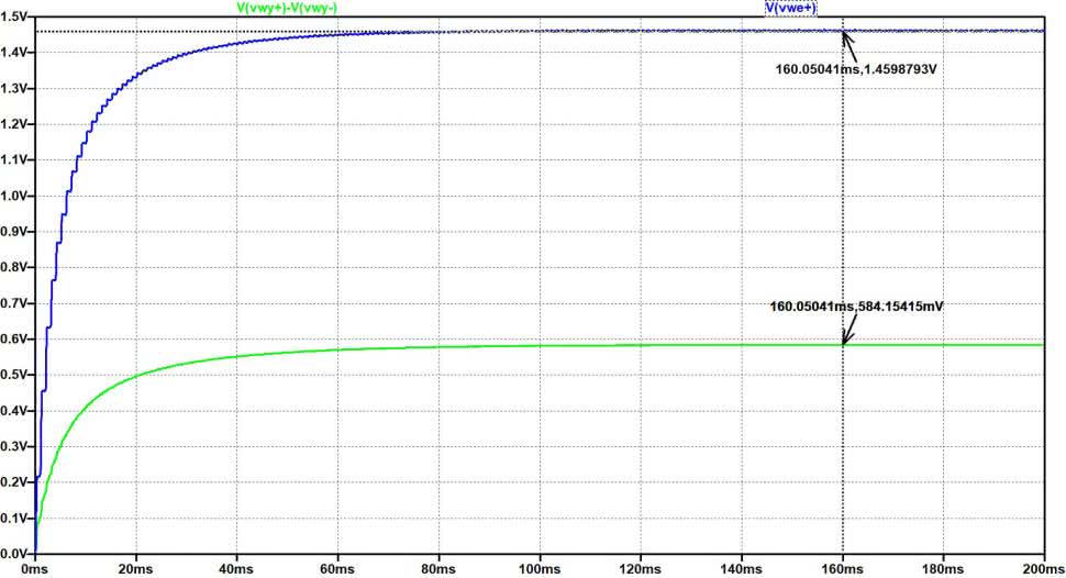 Na rysunku 80 przedstawiono przykładowe przebiegi czasowe podczas dochodzenia do stanu quasi-ustalonego dla sygnałów mierzonych na wyjściach obu układów pomiarowych – przy pobudzeniu ich na wejściach sygnałem sinusoidalnym o częstotliwości 1 kHz i amplitudzie 1,0 V.