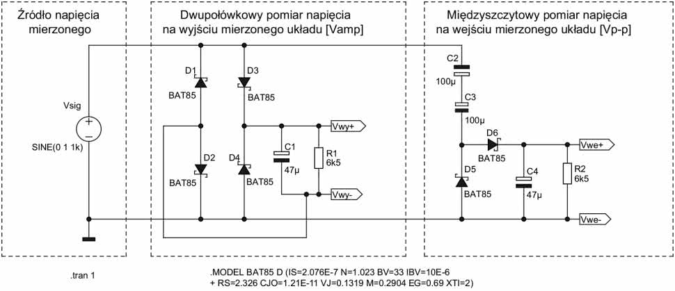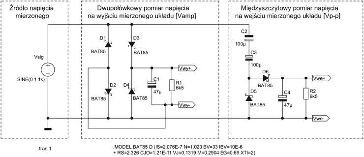 Na rysunku 79 zaprezentowano schemat obu omówionych prostych ustrojów pomiarowych, który posłużył do oszacowania ich charakterystyk przejściowych na drodze symulacji w środowisku LTspice. Dla uproszczenia prac oba układy były zasilane z tego samego źródła sygnału sinusoidalnego, którego amplituda była zmieniana ręcznie w trakcie kolejnych symulacji w dziedzinie czasu.