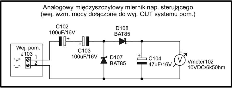 Do monitorowania obecności i przybliżonego poziomu sygnału sterującego na wyjściu filtra, wygładzającego sygnał z przetwornika DAC, wykorzystano miernik międzyszczytowej wartości tego napięcia (rysunek 78). Mierzony sygnał sterujący, doprowadzany na wejście J103 (złącze śrubowe typu ARK-2), poprzez połączoną szeregowo (i z przeciwnymi polaryzacjami) parę kondensatorów elektrolitycznych C102 i C103, trafiał na prosty układ podwajacza amplitudy napięcia wejściowego z diodami D107, D108 oraz kondensatorem wygładzającym C104. Podobnie jak w przypadku omówionego wcześniej ustroju pomiarowego, stała czasowa rozładowania miernika wynosiła około τ≈47 μF·6,5 kΩ=305,5 ms.