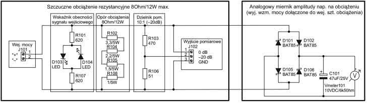 Przyjęto, że całkowita, ciągła moc strat w opracowanym sztucznym obciążeniu nie powinna przekraczać wartości 12 W, choć w opisanej dalej praktyce pomiarów wzmacniaczy elektroakustycznych (długotrwałe, ciągłe testy) celowano w maksymalną wartość wydzielanej mocy czynnej na poziomie zaledwie 5 W. Minimoduł sztucznego obciążenia został wyposażony dodatkowo w: optyczną, prostą sygnalizację obecności wzmocnionego sygnału na wejściu J101 (złącze śrubowe typu ARK-2) z rezystorami R101 i R107 oraz diodami LED D103, D104, a także w dzielnik pomiarowy 10:1 z rezystorami R103 i R106, dzięki któremu na wyjściu pomiarowym J102 (złącze śrubowe typu ARK-3) był dostępny zarówno bezpośredni sygnał mocy, jak i jego replika, stłumiona o 20 dB (do dalszego pomiaru i analizy we wnętrzu omawianego minisystemu pomiarowego).