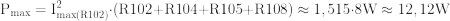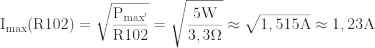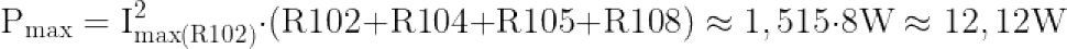 Z takiego rozwiązania wynika, że faktyczna maksymalna dopuszczalna moc strat dla całego kwartetu oporników, z uwagi na ich połączenie szeregowe, więc i taki sam prąd w każdym z elementów, jest limitowana przez ten opornik, w którym będzie wydzielała się największa moc strat termicznych. Jest nim rezystor R102 o wartości 3,3 Ω, dla którego maksymalna wartość skuteczna prądu wynosi: