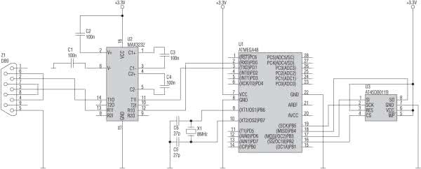 Z dostępnych pamięci nieulotnych można wykorzystać do tego celu pamięci DataFlash, które mają pojemność nawet do kilu MB. Pamięci DataFlash mają wbudowany interfejs kompatybilny z SPI, w którym częstotliwość sygnału zegarowego może wynosić nawet 20 MHz. Obsługę pamięci zilustrujemy na przykładzie AT45DB011B o pojemności 135168 kB.