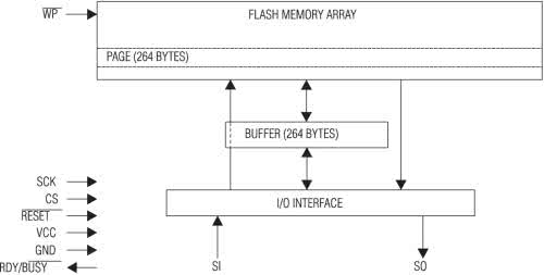 Na rys. 16 został przedstawiony schemat blokowy pamięci AT45DB011B. Posiada ona 512 stron po 264 bajty. Pamięć ma także bufor o pojemności jednej strony. W pamięciach DataFlash zapis danych następuje stronami, do czego jest wykorzystywany wspomniany bufor. Po zapełnieniu całego bufora danych, należy do pamięci wysłać rozkaz zapisu z adresem strony, do której ma nastąpić zapis. Dostępne pamięci DataFlash mają różne wielkości buforów. Są nawet takie, które mają ich kilka. Zastosowany w pamięciach DataFlash bufor znacząco zwiększa szybkość zapisu do niej danych. Zapis całej strony dla wykorzystywanej pamięci trwa ok. 7 ms. W przypadku typowych pamięci EEPROM zazwyczaj tyle czasu trwa zapis jednego bajta.