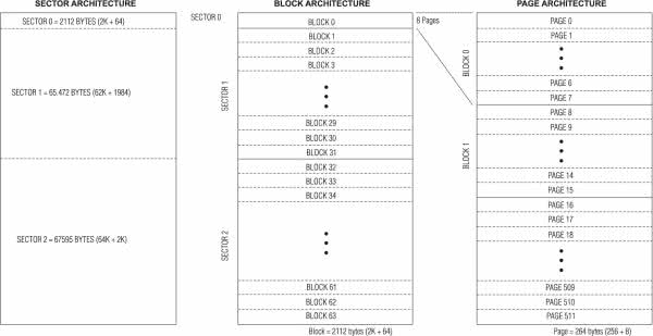 Na rys. 17 przedstawiono organizację pamięci AT45DB011B. Można wyróżnić trzy sektory, w skład których wchodzą bloki, bloki z kolei dzielą się na strony – każda z nich ma pojemność 264 bajty. Gdyby pamięć DataFlash miała pracować podobnie jak pamięć EEPROM, czyli z zapisem danej z pominięciem bufora, to jest możliwość zastosowania takiej emulacji (emulacja pamięci EEPROM przez pamięć DataFlash). Zostało to wykorzystane w przykładzie obsługi pamięci AT45DB011.