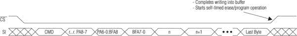 Na rys. 18 przedstawiono przebiegi sygnałów przy wysyłaniu komendy &H53. Po wysłaniu komendy zostaje wysłany dwubajtowy adres strony. W procedurze zapisu danej do pamięci jest wysyłana kolejna komenda o adresie &H82 (Main Menory Page Program through Buffer), która jest komendą zapisu danej do bufora wraz z późniejszym jego zapisaniem do zaadresowanej strony. Po modyfikacji zawartości bufora jest zapisywana do zaadresowanej strony pamięci.