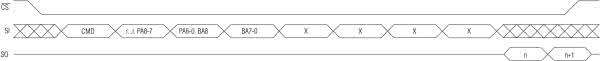 Na rys. 20 przedstawiono przebiegi odnoszące się do komendy &H52. Po wysłaniu komendy wysyłany jest adres strony, po którym wysyłany jest adres słowa dla danej strony. Czyli można za jej pomocą zaadresować i odczytać dowolne słowo pamięci DataFlash.