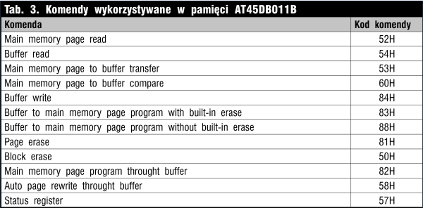 W tab. 3 przedstawiono komendy dostępne w pamięci AT45DB011B. Niektóre z nich zostały wykorzystane w przykładowym programie. W procedurze zapisu danej do pamięci, po obliczeniu adresu zostaje wysłana komenda mająca adres &H53 (Main Memory Page to Buffer Transfer). Komenda ta wczytuje wybraną stronę do bufora pamięci.