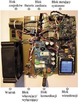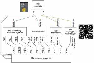 System o opisanej powyżej funkcjonalności powinien składać się z określonych bloków funkcjonalnych. Są to: blok sterujący systemem, blok czujników, blok włączający/wyłączający dołączone urządzenia, blok komunikacji, blok wizualizacji danych oraz blok zasilania. Schemat pokazujący sposób w jaki połączone zostały ze sobą elektrycznie bloki funkcjonalne systemu przedstawiono na rysunku 2. Każdy z bloków zostanie oddzielnie przedyskutowany.