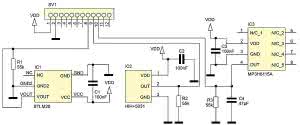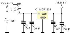 Pozostałe bloki funkcjonalne wymagają napięcie o niższym potencjale. Aby je wytworzyć, użyto regulatora napięcia MCP1825S firmy Microchip. Jego najważniejsze parametry to: zakres napięcia wejściowego do 6 V, wydajność prądowa do 500 mA, siedem opcji napięcia wyjściowego (0.8/1.2 /1.8/2.5/3.0/3.3/5.0 V), trzy opcje obudowy (DDPAK, TO-220, SOT-223).