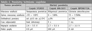 Następnie wartości liczbowe odpowiadające poziomom napięcia zostają podstawione do wzorów (podanych przez producentów w dokumentacji czujników) określających zależność między napięciem a mierzoną wielkością. Tak wyznaczone zostają liczby, które w pewnej jednostce wyrażają zmierzone wielkości. Parametry techniczne wybranych na potrzeby projektu czujników przedstawiono w tabeli 2.