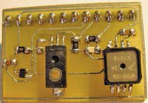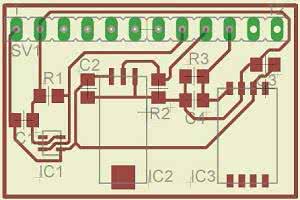 Dodatkowo między linią zasilania i linią masy każdego czujnika umieszczony jest filtrujący napięcie zasilające kondensator o pojemności 100 nF. Linia zasilania, masy oraz trzy linie połączone z wyjściem czujników doprowadzone są do gniazda sygnałowego. Layout płytki pokazano na rysunku 5. Zdjęcie płytki zaprezentowano na rysunku 6.