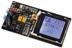 Aby w łatwy sposób podłączyć wyświetlacz do mikrokontrolera znajdującego się na płytce FRDM-KL25Z, wykorzystano moduł o nazwie KAmodTFT2 z oferty sklepu Kamami.pl. Moduł ten jest płytką, na której zintegrowano wyświetlacz telefonu Nokia 6100/6610, gniazdo szpilkowe połączone z wyprowadzeniami wyświetlacza, bufory linii sterujących, zworkę pozwalającą na wybór napięcia zasilania (3 lub 5 V) oraz obwód zasilania składający się z regulatora napięcia (do zasilania wyświetlacza) i przetwornicy podwyższającej napięcie (do zasilania diod podświetlenia wyświetlacza). Wygląd modułu KAmodTFT2 pokazano na rysunku 9.