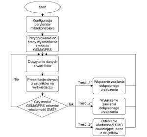 Drugie zadanie polega na wyświetlaniu obliczonych wartości na wyświetlaczu (rysunek 13). Ostatnim, trzecim zadaniem jest sprawdzanie czy moduł GSM/GPRS odebrał nową wiadomość SMS, a jeśli tak, odpowiednie na niego reagowanie. W zależności od treści odebranego SMSa, a więc znaku '1', '2' lub '3', mikrokontroler odpowiednio włącza klucz tranzystorowy, wyłącza klucz tranzystorowy lub odsyła do nadawcy wiadomość SMS zawierającą dane z czujników (rysunek 14).