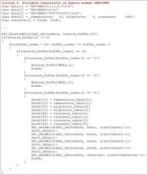 Jeśli wartość ta wynosi 3, mikrokontroler używając funkcji AS1_SendBlock() wysyła do modułu komendy AT, których skutkiem jest wysłanie SMSa zwrotnego z informacją o zmierzonych parametrach środowiskowych. Odpowiedni kod źródłowy pokazano w listingu 2.