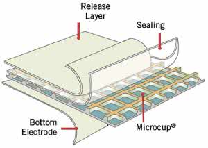 Jeżeli poddamy mikrokapsułki działaniu pola elektrycznego, to białe i czarne cząstki będą się przemieszczać. Wyświetlacz ma wbudowane 2 elektrody. Jedna przeźroczysta jest umieszczona na powierzchni ekranu wyświetlacza, a druga pod mikrokapsułkami (rysunek 1). Kiedy górna elektroda będzie miała potencjał dodatni a dolna ujemny, to ujemnie naładowane cząstki czarne zostaną przez pole elektryczne przesunięte do góry i wyświetlacz w tym miejscu będzie zaczerniony.