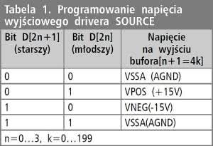 Elektrody sterujące również są matrycowo: do każdego z pikseli jest doprowadzona jedna z 800 elektrod drivera SOURCE i jedna z 600 elektrod drivera GATE. Driver SOURCE jest przeznaczony do sterowania elektrodami kolumn matrycy i ma 800 wyprowadzeń pracujących z trzema napięciami wyjściowymi: +15 V, -15 V i 0 V. Z driverem jest połączony dwukierunkowy rejestr o długości 800 słów 2-bitowych. Rejestr jest podzielony na 4 grupy. Każde słowo 2-bitowe odpowiada za napięcie na wyjściu drivera według zależności pokazanej w tabeli 1.