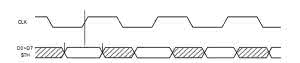 Zapis rejestru SOURCE polega na zapamiętaniu 200 bajtów przez równoległy, 8-bitowy interfejs komunikacyjny. Dane z linii D0…D7 są zapisywane do rejestru przy narastającym zboczu na linii CLK. Zostało to pokazane na rysunku 4.