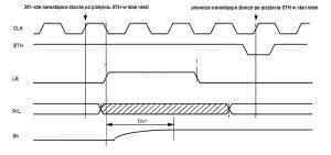 Każdy bajt jest wpisywany narastającym zboczem sygnału zegara CL (rysunek 6). Wprowadzenie zmiennej old_data zapobiega niszczeniu stanów nieużywanych linii portu przy zapisywaniu linii magistrali danych. Po zapisaniu 200 bajtów jest aktywowany sygnał OE i zawartość rejestru LATCH pojawia się na wyjściu bufora SOURCE. Jednocześnie na linii CPV jest wymuszane zbocze opadające a potem narastające.