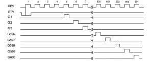 Podanie przebiegu na każdą z elektrod sterujących sprowadza się do wykonania kilku zapisów (sekcji) całego wyświetlacza, jak to zostało pokazane na rysunku 7. Okres skanowania wyświetlacza jest określony przez czas od wysterowania G0 do wysterowania G599, czyli czas potrzebny do zapisania całego wyświetlacza. Przykład zapisu piksela pokazano na rysunku 8. Każdy z pikseli jest zapisywany 12 razy (12 sekcji). Każda sekcja to jeden zapis całego wyświetlacza.