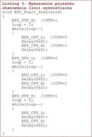 Po każdym zapisaniu wiersza trzeba zmienić zawartość licznika wierszy, czyli rejestru GATE, aby następny wiersz był zapisywany w kolejnej pozycji na wyświetlaczu. Cykl uaktywnienia zapisywania rejestru, aby sterował pierwszym wierszem (G1), rozpoczyna się od wyzerowania wyjścia STV i wymuszenia zbocza narastającego na linii zegarowej CPV (rysunek 6). Każda sekwencja zapisu rejestrów wyświetlacza powinna się zaczynać od wykonania procedury EPD_StartScan() wymuszającej taką sekwencję (listing 3).