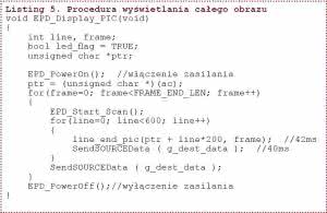 Rozpoczyna się od włączenia zasilania matrycy (procedura EPD_PowerOn()). Liczba sekcji zapisu jest określona przez wartość FRAME_END_LEN. W każdej sekcji zapisu najpierw jest wywoływana funkcja EPD_Start_Scan() ustawiająca skanowanie linii na początek, czyli od aktywnego sygnału na linii G0. Potem program wywołuje 600 razy w pętli funkcję linie_end_pic ( listing 6).