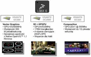 Jako przykład wsparcia dla GFX w mainstramowym SoC na rysunku 3 pokazano trzy GPU zastosowane w Freescale i.MX6Q/D. W jego najbardziej rozbudowanej wersji w rodzinie i.MX6, procesor GPU wspierający wyświetlanie 3D ma 4 rdzenie cieniujące o wydajności 24 GFLOPS. Należy przy tym zauważyć obecność dwóch dodatkowych rdzeni przeprowadzających wyspecjalizowane operacje dla zwiększenia wydajności typowej aplikacji embedded: przyśpieszają one kompozycję warstw i grafiki wektorowej.