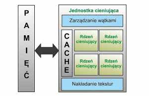 Z tego powodu, pokazana na rysunku 4, zunifikowana jednostka cieniująca wbudowana w GPU składa się z pewnej liczby identycznych rdzeni, pamięci cache, jednostki zarządzania wątkami (więcej na ten temat będzie dalej) oraz jednostki dostępu do tekstur (wykonującej konwersję i próbkowanie). W wielu implementacjach każda jednostka cieniująca ma możliwości układu SIMD. Liczba jednostek różni się zależnie od rynku docelowego i wymaganej wydajności. Układy SoC, którym stawia się wymaganie niewielkiego poboru mocy, mają od jednego do kilku rdzeni cieniujących. Inaczej jest w kartach graficznych z "najwyższej półki", których procesory mogą mieć nawet kilka tysięcy rdzeni.