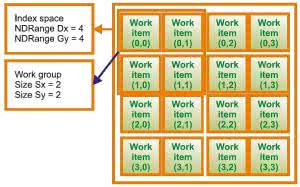 Ogólnie, macierz wejściowa do przetwarzania jest nazywana "Index space" (rysunek 6) i ma wielkość "NDRange". W naszym wypadku mamy Gx=4 i Gy=4 (uwaga - wymiary macierzy x, y, z nie muszą być równe). Macierz "Index space" będzie przetwarzana w segmentach "Work group" będących grupą elementów roboczych, które będą obrabiane przez co najmniej jedną jednostkę obliczeniową (wiele jednostek obliczeniowych może być używanych równolegle). Upraszczając, możemy spodziewać się, że liczba elementów roboczych w grupie roboczej odpowiada liczbie elementów przetwarzanych w rzeczonej jednostce obliczeniowej, a zatem w naszym przykładzie pokazujemy grupę roboczą zawierającą 4 elementy (rzeczywistość jest nieco bardziej złożona). Każdy element macierzy wejściowej (część grupy roboczej) nazywany "Work item" będzie przetwarzany przez instancję kernela operującą na elemencie przetwarzanym i jest identyfikowana za pomocą unikalnego identyfikatora "Global ID". Jest on nadawany przez pozycję elementu roboczego w przestrzeni "Index" grupy roboczej. Każda grupa robocza jest unikalna i ma ściśle określoną pozycję w przestrzeni "Index", więc identyfikator "Global ID" każdego elementu roboczego może być wyznaczony przez jego pozycję w grupie roboczej. Należy również wprowadzić koncepcję "Local ID", który jest indeksem elementu w obrębie danej grupy roboczej. Ta koncepcja bazuje na podziale przetwarzania w obrębie grupy dla lepszego użycia pamięci lokalnej.