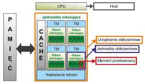 - Jednostka przetwarzająca: najmniejszy blok używany na poziomie wątku. Typowo jest to grupa elementów procedowanych, która jest umieszczona pomiędzy jednostką zarządzającą pojedynczym wątkiem, a jednostką zarządzającą. Oznacza to, że ta grupa będzie przetwarzana krok po kroku w tym samym strumieniu instrukcji. W naszym przykładzie, jednostka obliczeniowa jest reprezentowana przez blok zunifikowanych jednostek cieniujących.