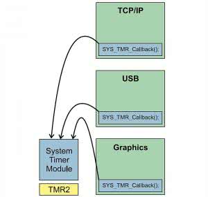 Żeby temu zapobiec, stosuje się usługę systemową SYS_TMR_Callback(); opartą o działanie licznika Timer2. Jej zadaniem jest zapobieganie kolizjom dostępu i jednocześnie zapewnienie dostępu do usługi czasowej każdemu z żądających procesów (rysunek 2). Każdy z procesów korzysta z odseparowanych żądań i dzięki temu nie przeszkadzają sobie nawzajem.