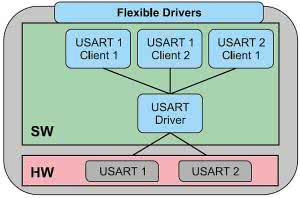 Sterowniki urządzeń są przeznaczone do obsługi w miarę prostych układów peryferyjnych na przykład Timerów, UART, I2C, SPI, C/A, A/C itp. Bardziej skomplikowane peryferia na przykład USB, czy obsługa LAN z protokółem TCP/IP wymaga obsługi złożonych protokołów. Równie rozbudowane są procedury graficzne.