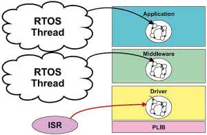 Są systemy, które wykorzystują middleware i muszą mieć "otwartych" kilka niezależnych aplikacji jednocześnie. W takim wypadku opisywana metoda poolingu używająca pętli głównej do sekwencyjnego wywoływania modułów może nie być wystraczająca. Tak się dobrze składa, że moduły Harmony mogą być uruchamiane bezpośrednio z procedurach obsługi przerwania ISR lub przez wątki systemu RTOS. Użycie przerwań z odpowiednio zaprogramowanymi priorytetami eliminuje opóźnienie spowodowane oczekiwaniem na uruchomienie przez inny moduł. To opóźnienie może być spowodowane oczekiwaniem na dokończenie pollinigu w pętli głównej maszyny stanów.