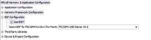 W module są umieszczone 3 diody LED połączone do linii portów RD0, RD1 i RD2, oraz 3 przyciski podłączone do linii RD6, RD7 i RD13. Jeżeli producentem mikrokontrolera, modułu ewaluacyjnego i oprogramowania jest ta sama firma, to często się zdarza, że moduły ewaluacyjne są wspierane. Do tego celu w MHC służy opcja konfiguracyjna BSP Configuration (rysunek 11).