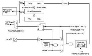 Mikrokontroler PI32MX795F512L ma wbudowanych 5 układów czasowo licznikowych Timer1....Timer5. Wszystkie liczniki są 16-bitowe, ale układy Timer2 i Timer3, oraz Timer4 i Timer5 można łączyć w pary tworząc liczniki 32-bitowe. My użyjemy 32-bitowego licznika Timer4/5. Jego schemat blokowy pokazano na rysunku 12. Jak każdy układ peryferyjny, Timer 4/5 musi przed użyciem zostać skonfigurowany. W tym celu programista musi sięgnąć do opisu rejestrów konfiguracyjnych SFR.