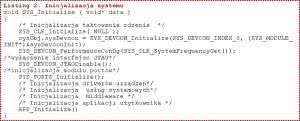 Inicjalizacja systemu SYS_initialize() (listing 2) polega głównie na zainicjowaniu układów taktowania rdzenia i układów peryferyjnych, domyślnym wyłączeniu interfejsu JTAG oraz zainicjowaniu układów portów. Na tym etapie nie używamy ani driverów urządzeń, ani middleware. Kiedy te moduły pojawią się w projekcie, to muszą tu być zainicjowane.